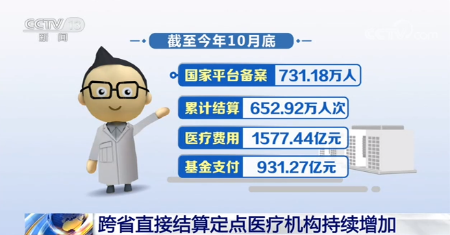根據國家醫保局公佈的數據,截至今年10月底,全國住院費用跨省直接結算定點醫療機構數量為37938家,比上月增加1392家;國家平台備案731.18萬人,累計結算652.92萬人次,醫療費用1577.44億元,基金支付931.27億元。
