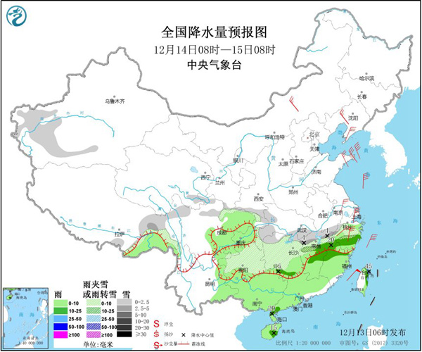 今天早晨,中央氣象台繼續發佈寒潮藍色預警,預計,12月13日08時至12月15日08時,東北地區東部、西北地區東南部、華北大部、黃淮大部、江淮大部、江漢、江南、西南地區東部、華南大部等地大部將先後降温6~8℃,其中,湖南西南部、貴州東南部、廣西中北部等地部分地區降温可達10℃。降温過後最低氣温0℃線將南壓至貴州南部至浙江西北部一線。北方地區有4~6級、陣風7~8級的偏北風,南方地區有4~5級偏北風,江河湖面陣風可達6~7級,近海海區有6~8級、陣風9級的偏北風。