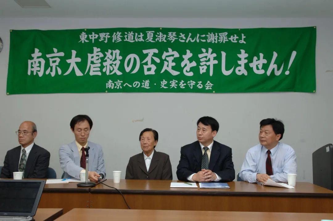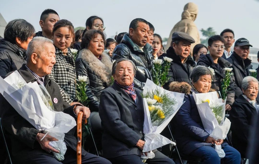 2019年12月3日,南京大屠殺倖存者葛道榮(前排左一)、夏淑琴(前排左二)、艾義英(前排右一)及新確認死難者周萬榮的女兒陶秀華(前排右二)在家祭活動現場。新華社記者 李博 攝