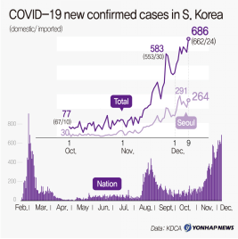 在過去的一週,韓國每天的單日新增病例數都高達600人左右,其中大多數都集中在首都圈,防疫部門預計這一數字可能在下週上升至900。