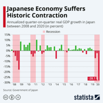 而此前,日本經濟已連續三個季度下滑,第二季度按年率計算下滑28.1%,是有可比數據以來最大降幅。