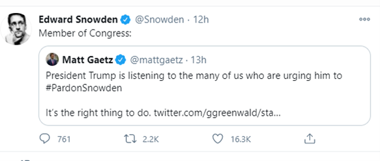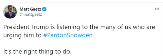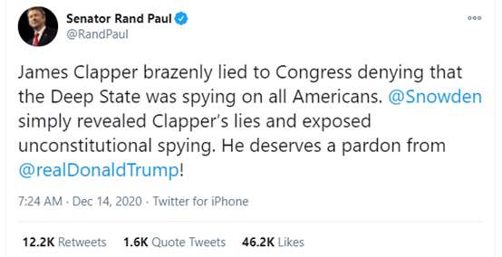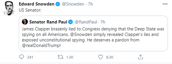 如下圖所示,保羅今天早上就發帖説,他認為斯諾登揭露了美國的“深層政府”監控美國民眾的事實,所以斯諾登值得被特朗普特赦。