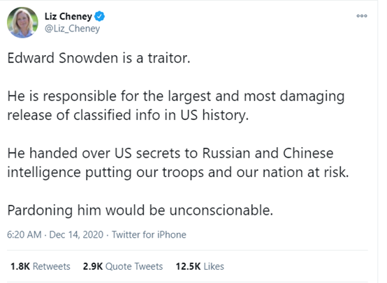 所以,除了保羅外,其他一些支持特朗普的美國政客和保守派公知,也在紛紛呼喚特朗普特赦斯諾登,以“打臉”那個他們口中的“深層政府”。這背後的用意,自然是想在美國當選總統拜登和他所代表的民主黨上台之前,好好地噁心他們一下。畢竟斯諾登可是在美國前民主黨籍總統奧巴馬當政時期爆出來的醜聞,而且奧巴馬一直在堅持要求追捕他。