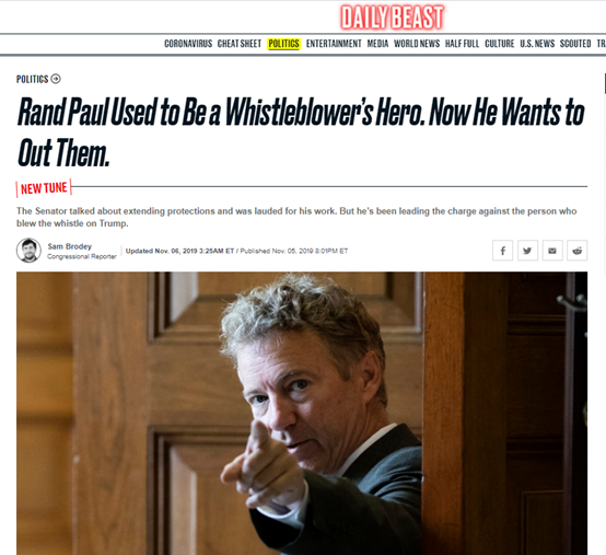 就拿保羅來説吧。美國媒體《每日野獸》就曾在去年揭露説,雖然在斯諾登的事情於2012年曝光後,這個保羅一直表現得很“同情”以及“支持”斯諾登的“吹哨”行為,還曾在2013年和2015年美國民主黨籍總統奧巴馬當政時推動過保護“吹哨人”的法律草案。可在特朗普執政後,他卻對一名曝光特朗普“想通過施壓烏克蘭政府,以換取總統競選對手拜登黑料”的“吹哨人”變換了態度,威脅要將這名舉報人的名字公之於眾。