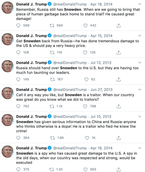 當然,要説對斯諾登態度變化最“劇烈”的,還是特朗普自己。有美國網民就發現,在成為美國總統之前,特朗普曾經在自己的社交賬號上對斯諾登發起過大量的攻擊,不僅將他説成是美國的“叛徒”乃至“垃圾”,還多次抨擊奧巴馬政府對他的打擊太過軟弱。可自從他成為美國總統後,他卻很快鬆口,甚至在今年8月時還曾公開表示自己“正在考慮”特赦斯諾登這件事。