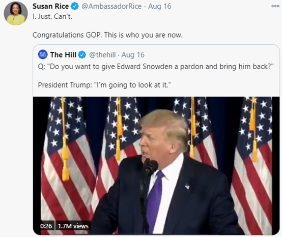 換言之,這些如今呼籲特赦斯諾登的特朗普的支持者和共和黨政客,他們關心的其實並不是什麼給“吹哨人”伸張正義,不過是想利用斯諾登的情況去攻擊自己的政敵罷了。