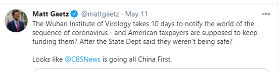 (圖為馬特·蓋茨今年5月為幫特朗普當局推卸防疫失職的責任而編造謠言攻擊中國和福奇的內容)