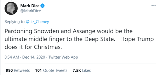 至於其他呼籲特赦斯諾登的特朗普支持者吃相就更難看了。比如在此次疫情期間,他們就不斷對曝光特朗普政府防疫問題的“吹哨人”惡語相加,甚至還多次散播虛假信息,謊稱新冠疫情並不嚴重,指控是美國的“深層政府”在誇大疫情,以進一步“掌控”美國。