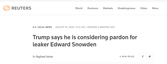 (圖為英國路透社報道稱特朗普在今年8月時改口,表示他正在考慮特赦斯諾登事情)