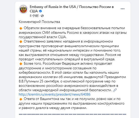 對此,俄羅斯駐美國大使館北京時間14日在臉書發佈的一份聲明中表示,注意到美國媒體又一次“毫無根據”地將黑客攻擊美國政府機構歸咎於俄羅斯。這份聲明還稱,俄羅斯不會在網絡領域開展攻擊行動。