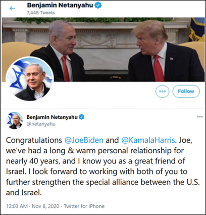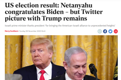“巧合”的是,12月14日這天正好是美國大選的選舉人團投票日,也就是大選結果被正式確認的日子。考慮到本次大選的當選總統是特朗普的“老冤家”拜登,內塔尼亞胡在這天“換封面”的舉動,就顯得內涵十足了。