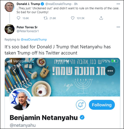 12月14日,推特上不少時政新聞博主驚訝地發現,內塔尼亞胡推特上那張標誌性的“與特朗普合影”封面不見了,新的封面圖已改為一張有關以色列特色物品的圖片。