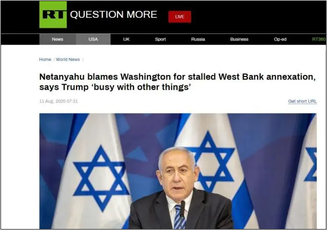 據今日俄羅斯電視台(RT)8月11日報道,內塔尼亞胡對以色列吞併約旦河西岸的計劃陷入僵局表示失望,他在講話中直言特朗普“正忙於做其他事情”,沒有把以色列的事情“放在首位”。