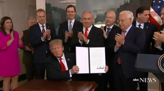 2019年3月25日,特朗普簽署公告,宣佈美國正式承認以色列對戈蘭高地擁有主權。據悉,戈蘭高地是以色列在1967年通過第三次中東戰爭中攫取的,包括聯合國在內的多國及國際組織均認為以色列此舉是“非法佔領”,在過去52年來,也從未有美國總統敢公然承認以色列對此地的主權。