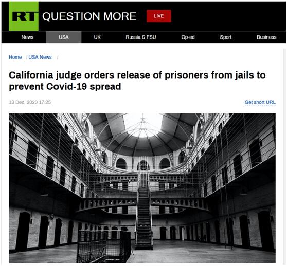 【環球網報道 見習記者 侯雅齡】“防止新冠傳播,加州法官下令釋放監獄囚犯”“今日俄羅斯”(RT)13日以此為題報道稱,美國加州橘鎮最高法院法官11日裁定,因為疫情,地方監獄的人數必須減少50%。