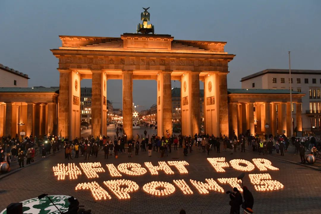 △當地時間2020年12月11日,支持積極應對氣候變化的人士在柏林勃蘭登堡門前點燃蠟燭,拼出“為1.5攝氏度而戰”的口號(圖片來源:視覺中國)