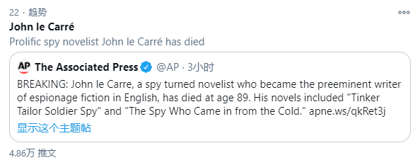 約翰·勒卡雷去世的消息一出,各大外媒紛紛報道。