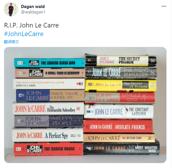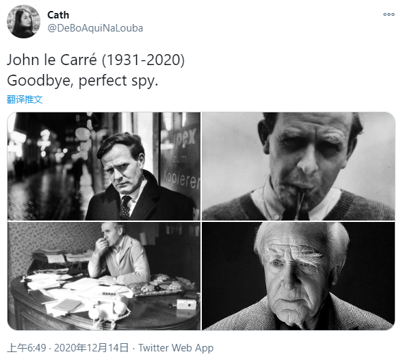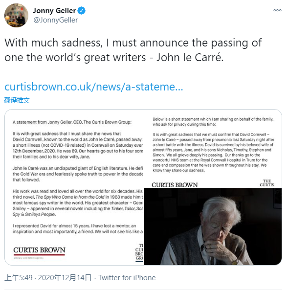 今天一早,勒卡雷的文學經紀人Jonny Geller發文,稱勒卡雷因肺炎(與新冠肺炎無關)於當地時間12日在皇家康沃爾醫院去世,