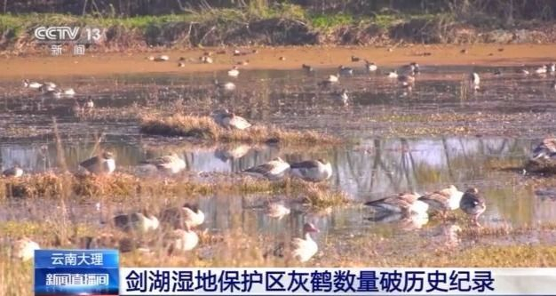 雲南大理的劍川劍湖濕地位於我國西部候鳥遷徙的主要通道上,這裏既是候鳥遷徙的集結點和停歇地,也是雲貴高原上水鳥越冬的重要棲息地。隨着冬季的到來,劍湖濕地迎來了近3萬隻越冬候鳥,經科研人員監測,國家二級重點保護鳥類灰鶴種羣數量達到33只,創保護區建立以來最高紀錄。
