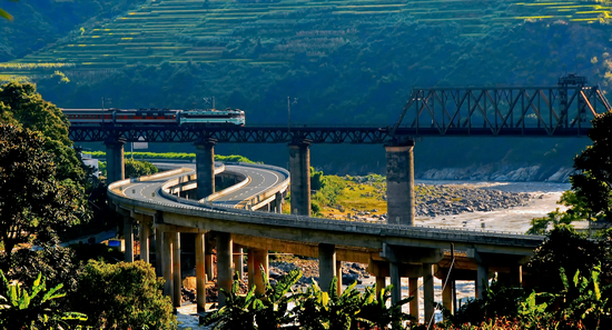 1952年草測,1958年動工,歷時12年建成的成昆線,由成都至昆明,行經四川盆地、橫斷山脈、雲貴高原。