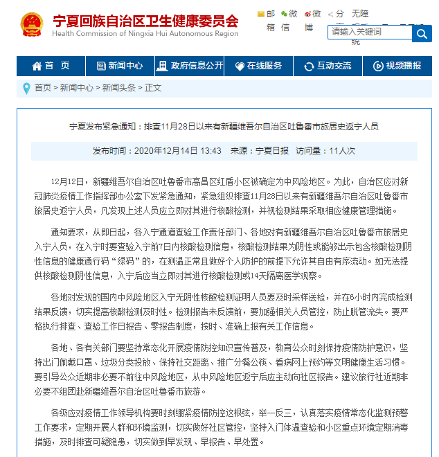 寧夏發佈緊急通知:排查11月28日以來有吐魯番市旅居史返寧人員