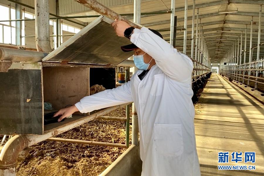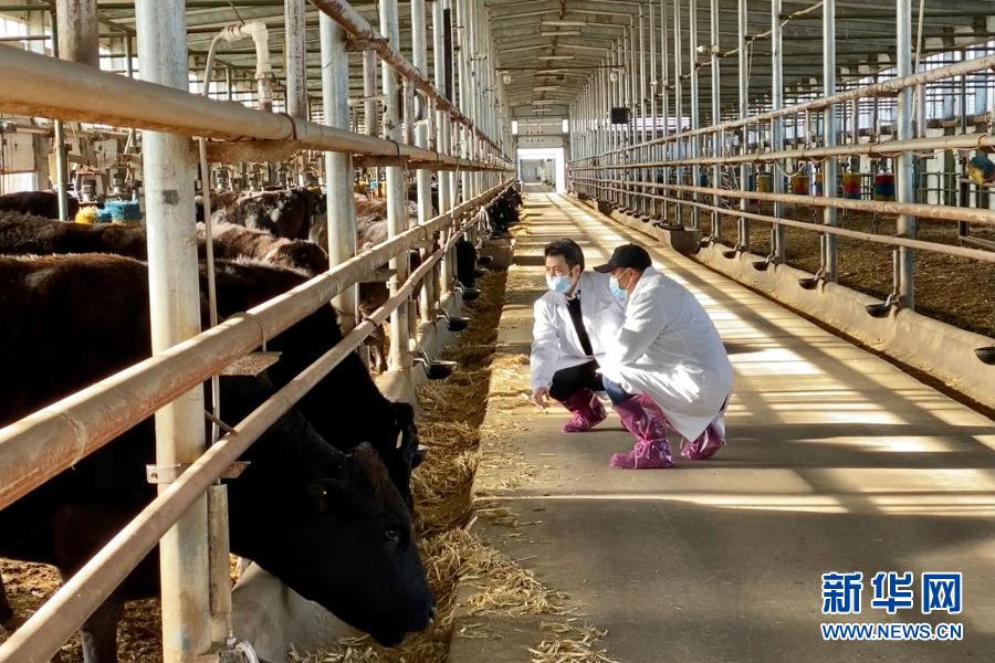 在黑龍江省龍江縣的和牛現代化繁殖基地,工作人員查看和牛生長狀況(12月3日攝)。新華社記者 劉赫垚 攝