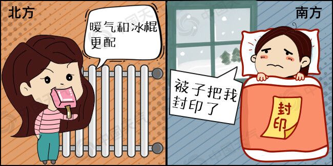 網友調侃“你在北方的暖氣裏吃冰棍,我在南方的被子裏瑟瑟發抖”、“北方禦寒只是裝備好,南方人抗凍才是屬性高。”