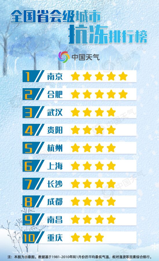 最抗凍的“不南不北地區”還可以細分為海派濕冷、楚派濕冷、川派濕冷等區域。那麼究竟哪個區域是抗凍屬性最高的“最中之最”呢?中國天氣網選取省會級城市作為代表,通過隆冬季節的平均最低氣温、相對濕度等因素來綜合排名,江蘇南京、安徽合肥抗凍指數為五顆星,為最抗凍城市。