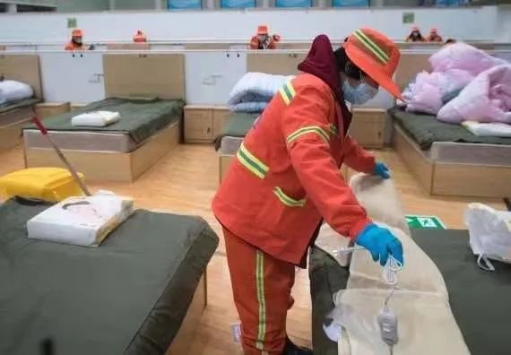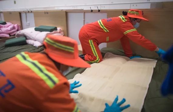 △2月12日,在武漢體育中心方艙醫院,工人在病牀上鋪設電熱毯。