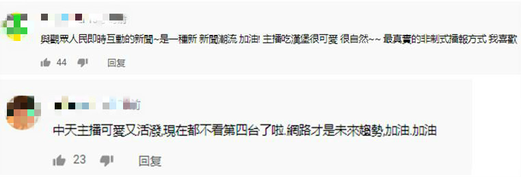 觀看直播的台灣網友紛紛在直播間裏留言:“與觀眾即時互動的新聞~是一種新新聞潮流,加油!主播吃漢堡很可愛,很自然~~最真實的非制式播報方式,我喜歡”,“中天主播可愛又活潑,現在都不看第四台了啦。網絡才是未來趨勢,加油、加油。”