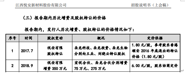 另據招股書披露,2017年7月,悦安新材的核心股東將部分股份轉讓給了公司總經理王兵,和市場部部長劉曉雲,轉讓價格參照2016年原股東香港順安退出時的轉讓價格1.8元/股;而在其後一年左右,悦安新材向員工持股平台宏悦合夥、嶽龍合夥增資時的價格就已經達6元/股,是一年前股權轉讓價格的三倍以上。悦安新材的原股東香港順安、深圳鑫盈源在2016年末退出悦安新材時的對應股價,僅相當於一年公司員工持股增資價格30%的原因,悦安新材在招股書中同樣未作出解釋。