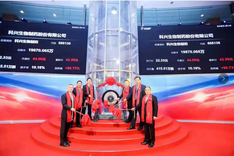12月14日,科興生物製藥股份有限公司(以下簡稱:科興製藥,股票代碼:688136)在科創板掛牌上市。當日開盤即衝高至44.36元,較發行價漲幅98.66%。作為中國重組蛋白藥物行業的開創者和先鋒企業,科興製藥擁有紮實的業績和良好的成長性,備受市場關注與追捧。