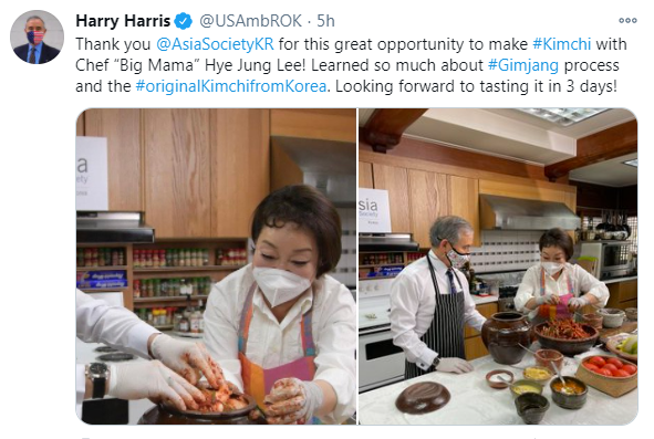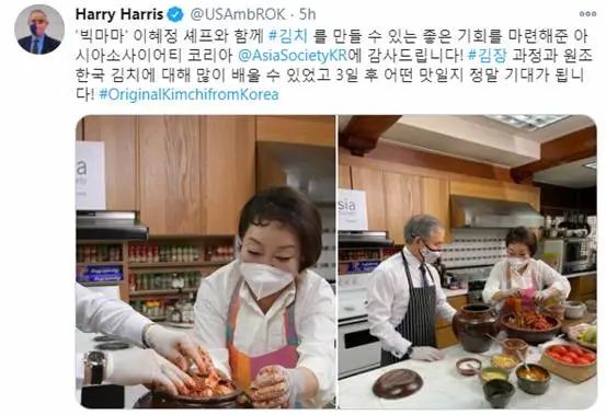 當天,這位美國大使還用英語和韓語發推,稱從韓國學到了很多有關冬天醃製鹹菜(Gimjang)的流程和傳統泡菜的知識,並貼出了自己學習製作泡菜的現場照片。