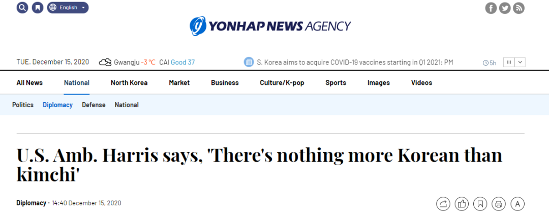 12月10日,哈里斯就發推宣稱,“很榮幸身處泡菜的起源地——韓國!要學習到如何製作最正宗、最美味的‘韓國製作’泡菜,我很激動。” 他還預告説自己將參加一場泡菜製作的網絡直播活動。當時就有韓國媒體稱哈里斯顯然“站在韓國這邊”。