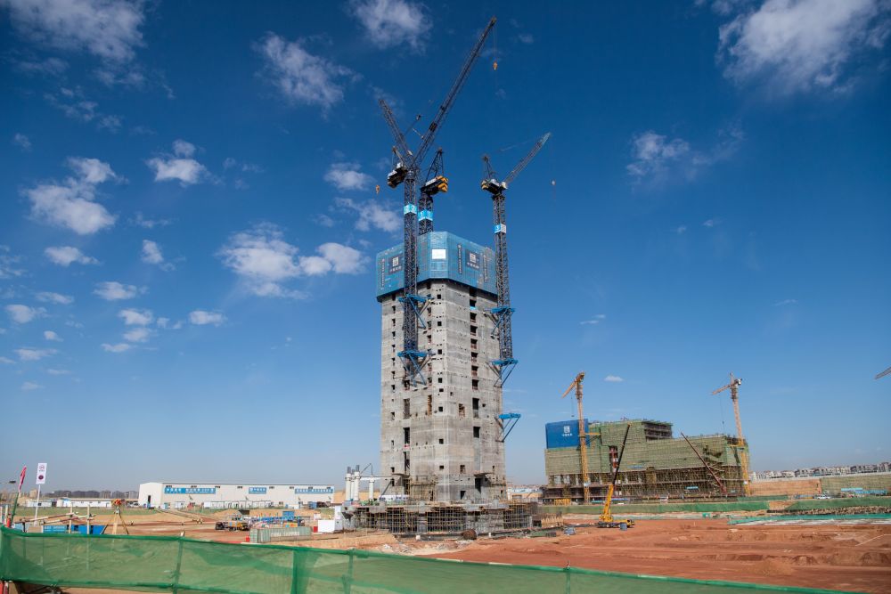 2019年12月10日在埃及新行政首都中央商務區項目工地拍攝的建設中的標誌塔。(新華社記者鄔惠我攝)