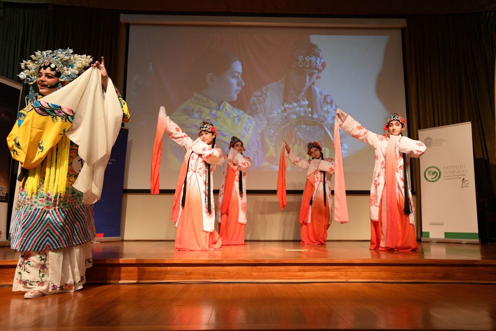 2019年8月9日,在智利聖地亞哥舉行的第12屆“漢語橋”世界中學生中文大賽智利賽區決賽上,來自比奧比奧大區聖尼古拉斯中學的16歲女生洛蕾託·約斯(左一)進行才藝表演。(新華社發,豪爾赫·比列加斯攝)