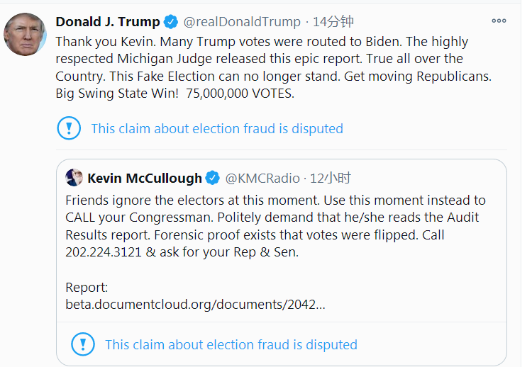 不過,他的上述兩條推文,以及他轉發麥卡洛的兩條推文,全部被推特標記上“這種關於選舉舞弊的説法具有爭議。”