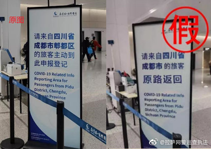 近日,在各大互聯網公共平台、即時聊天羣組出現“南京祿口國際機場正在遣返四川籍乘客”,並配有一張印有“請來自四川省成都市的旅客原路返回”的告示牌照片的虛假信息,嚴重違背事實,擾亂防疫公共秩序,引發廣大網民關注熱議,給四川及江蘇疫情防控工作帶來極大負面影響。獲此情況,西藏、四川、江蘇三地警方即刻成立聯合調查小組開展核查工作,經核查,該網民為“鄭某某”目前在拉薩活動,網傳圖片是“鄭某某”本人PS後發佈到互聯網平台,引發網上迅速擴散,造成不良社會影響。