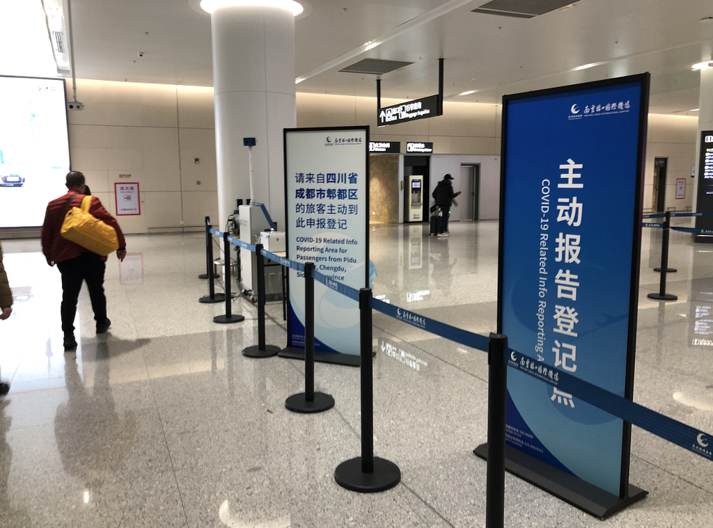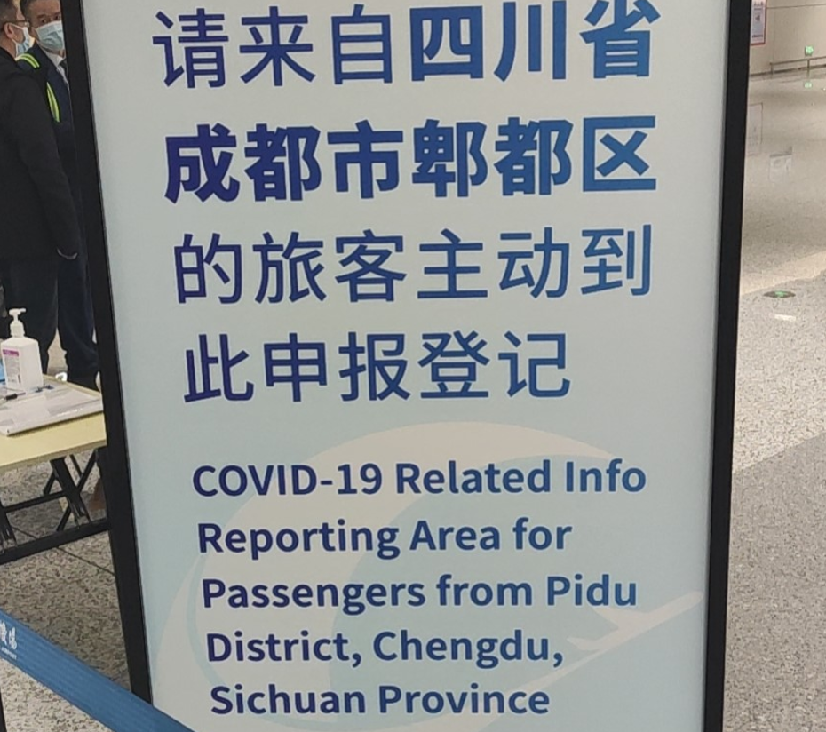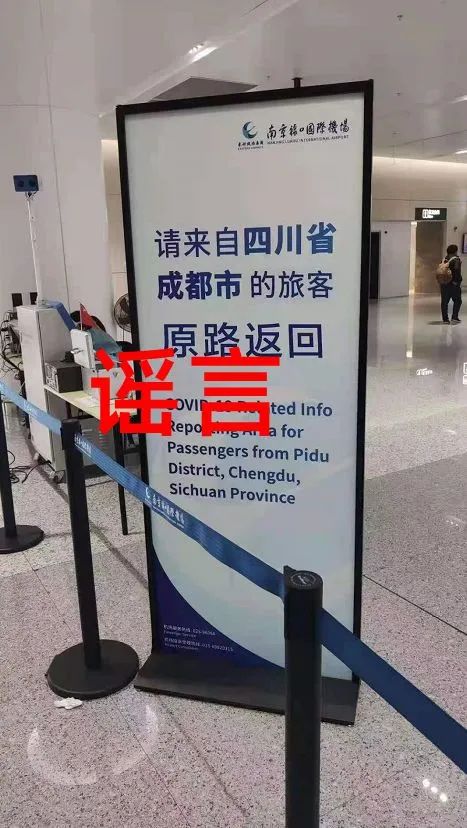 就此,川觀新聞記者求證了剛剛在南京祿口國際機場下飛機的網友@手術燈。據他拍攝的現場視頻顯示,標識牌上顯示的內容為*“請來自四川省成都市郫都區的旅客主動到此申報登記”,* 並非是網上流傳的“請來自四川省成都市的遊客原路返回”。