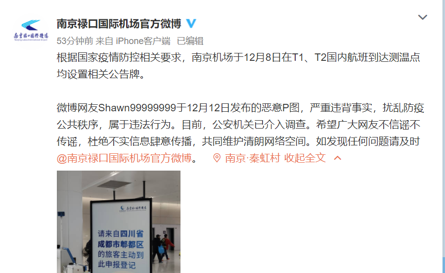12月12日,一張寫有疑似南京祿口國際機場在接機口標註“請來自四川省成都市的遊客原路返回”的照片在網上流傳,引起了眾多網友的熱議。