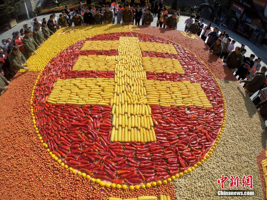 資料圖:2019年9月23日,秋分節氣,各地迎來“中國農民豐收節”。在河南欒川雞冠洞,民眾用當地的獼猴桃、山楂、大棗、板栗和玉米等山貨和糧食,繪製出邊長為7米的大型豐收圖,共慶豐收。中新社記者 王中舉 攝