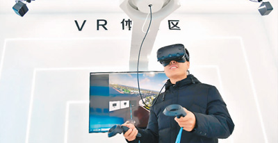 11月27日,在山東濟南歷城區,中建八局一公司技術人員在調試VR河道實景體驗系統。新華社記者 朱崢攝