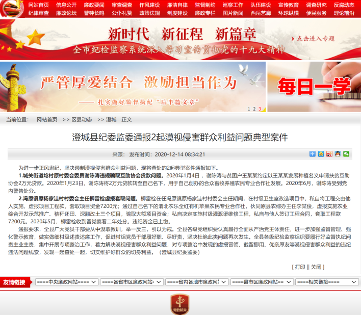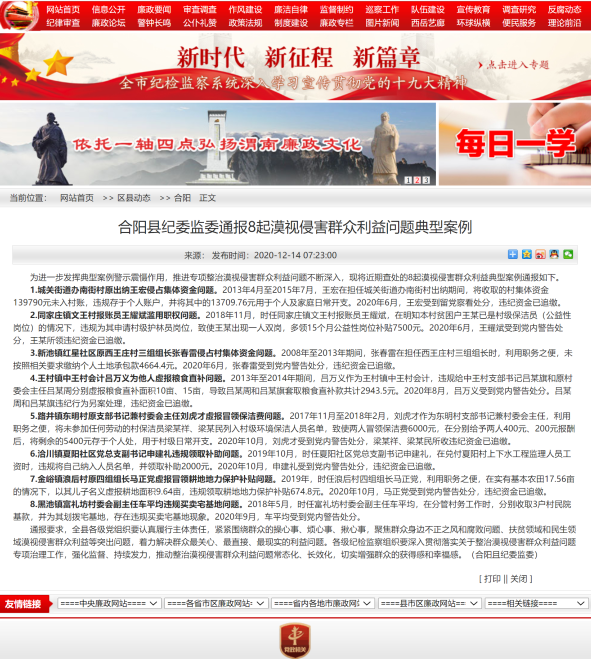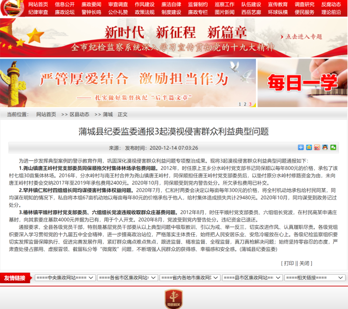 14日, 渭南紀委官網通報了蒲城、合陽、澄城近期查處的漠視侵害羣眾利益典型問題。為進一步正風肅紀,堅決遏制漠視侵害羣眾利益問題,發揮典型案例的警示教育作用,鞏固深化漠視侵害羣眾利益問題專項整治成果,現將13起漠視侵害羣眾利益典型問題進行通報。