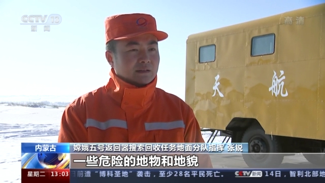嫦娥五號任務着陸場區指揮部成員 卞韓城: 我們從技術上採取了一些措施,比如我們將雷達的測量數據經過處理送到直升機和搜索車輛上,在中距離,我們在直升機和搜索車輛上,加裝了側向設備,來引導直升機和車輛搜索接近返回器,協助搜索人員快速地發現目標。