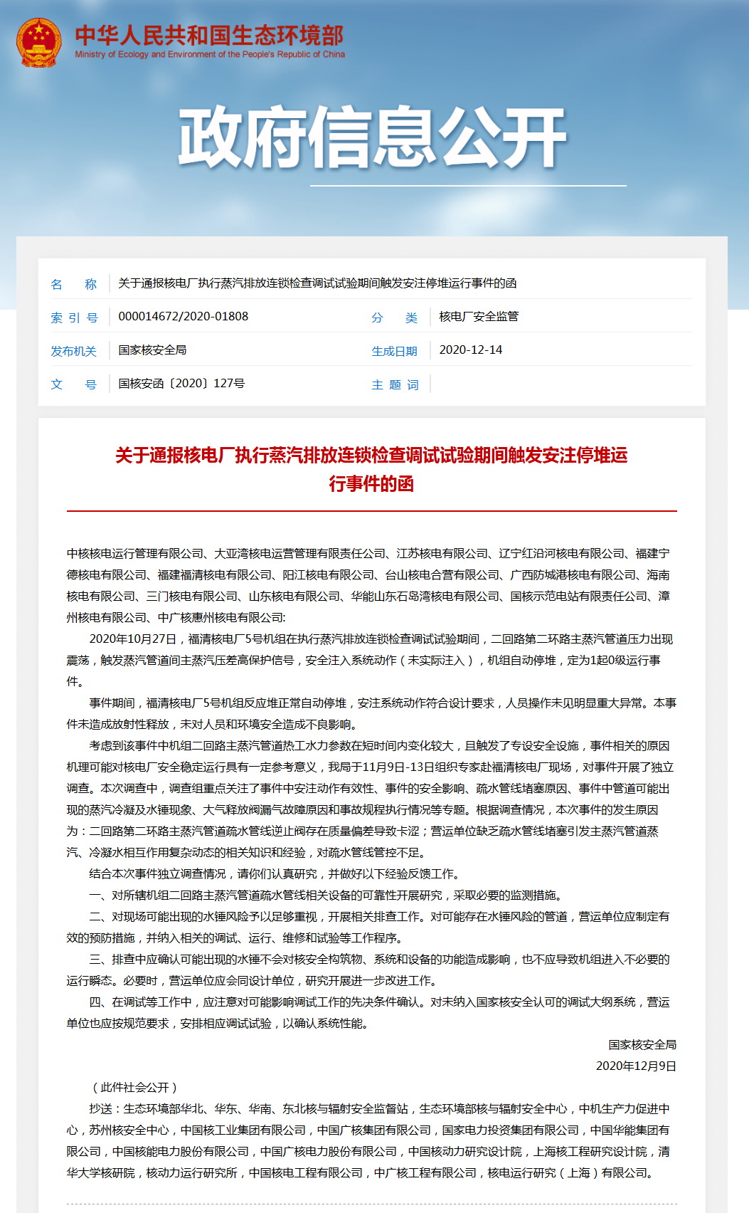 2020年10月27日,福清核電廠5號機組在執行蒸汽排放連鎖檢查調試試驗期間,二回路第二環路主蒸汽管道壓力出現震盪,觸發蒸汽管道間主蒸汽壓差高保護信號,安全注入系統動作(未實際注入),機組自動停堆,定為1起0級運行事件。