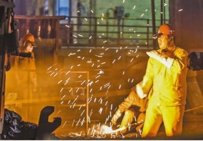 只見一米七八個頭、高大強壯的楊金安小心翼翼地抖動前臂,把剛從爐中舀出來的鋼水很有技巧地潑在地上……看着濺起的鋼花發叉量,楊金安心裏有了底:“老王,吹氧吧,含碳量不到18個!”只見他右手揮舞,聲音洪亮。師傅見他這般模樣,也會心一笑,放心地按下了控制鍵,氧槍隨之入爐,注入氧氣。鋼水錶面波瀾不驚,內裏卻已在發生劇烈的氧化反應。