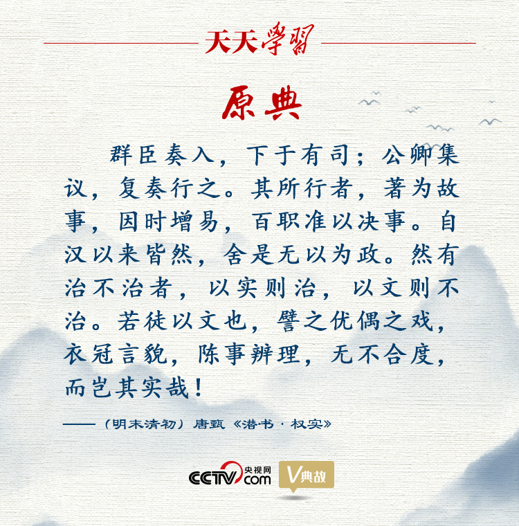 “以實則治,以文則不治”出自明末清初思想家唐甄所著的《潛書》。唐甄不僅是一位傑出的思想家,也是一位成功的實踐者。他在山西長子縣做知縣時,為了動員百姓種桑養蠶,不但挨家挨户做説服工作,而且帶頭示範。結果沒有發佈一紙文書通告,百姓就在一個月內種桑80萬株。他的成功經驗便是“為政貴在行”,“行”,就是落實。唐甄認為,文書通告只是“藉以通言語,備遺忘耳”,故而提出“以實則治,以文則不治”。唐甄的這一觀點,主要是針對當時官場中公文氾濫、有令不行的弊端提出的,並非一概否定發佈文告推行政令的作用。