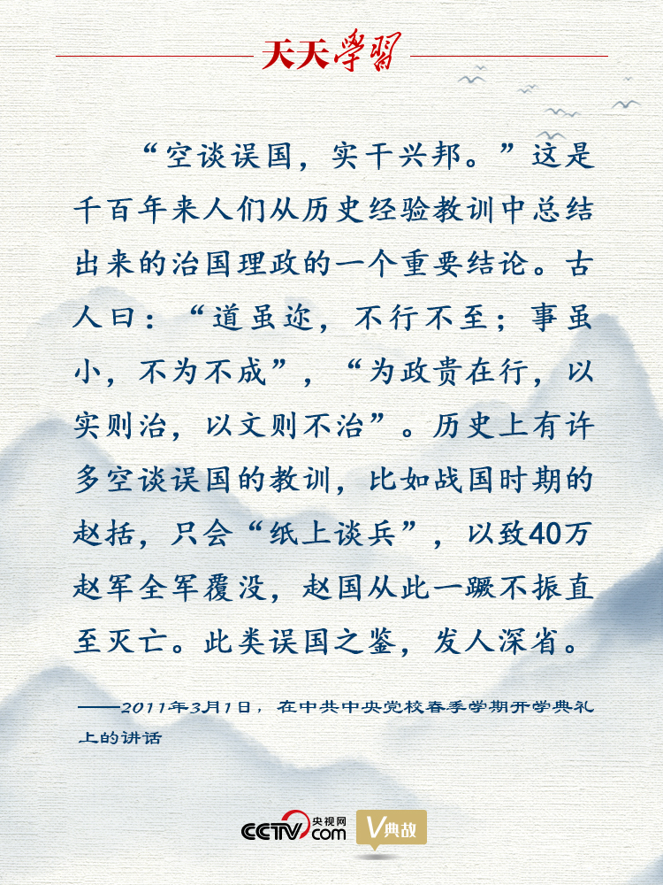 反對空談、強調實幹、注重落實,是我們黨的優良傳統,也是我們黨能夠在革命、建設和改革中不斷帶領人民奪取新勝利的關鍵。2011年在中央黨校春季學期開學典禮上,習近平同志強調,我們的所有成就,都是幹出來的。這裏的關鍵,就是始終注重抓落實。如果落實工作抓得不好,再好的方針、政策、措施也會落空,再偉大的目標任務也實現不了。為此,他用“以實則治,以文則不治”這句古語以及“紙上談兵”的故事加以闡明。
