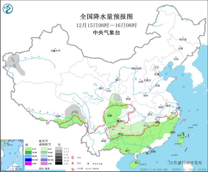 降水方面,受南下冷空氣與偏南暖濕氣流共同影響,昨天,江南中部及西南地區東部等地雨雪明顯,像是浙江中南部、江西北部、湖南東北部等地部分地區出現降雪、雨夾雪或雨轉雪,降水量有3~15毫米;貴州西部和東南部、湖南中部等局地出現凍雨。