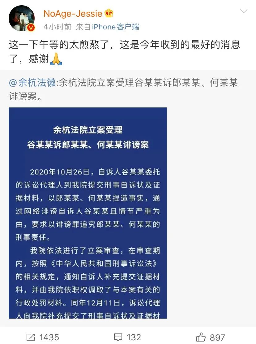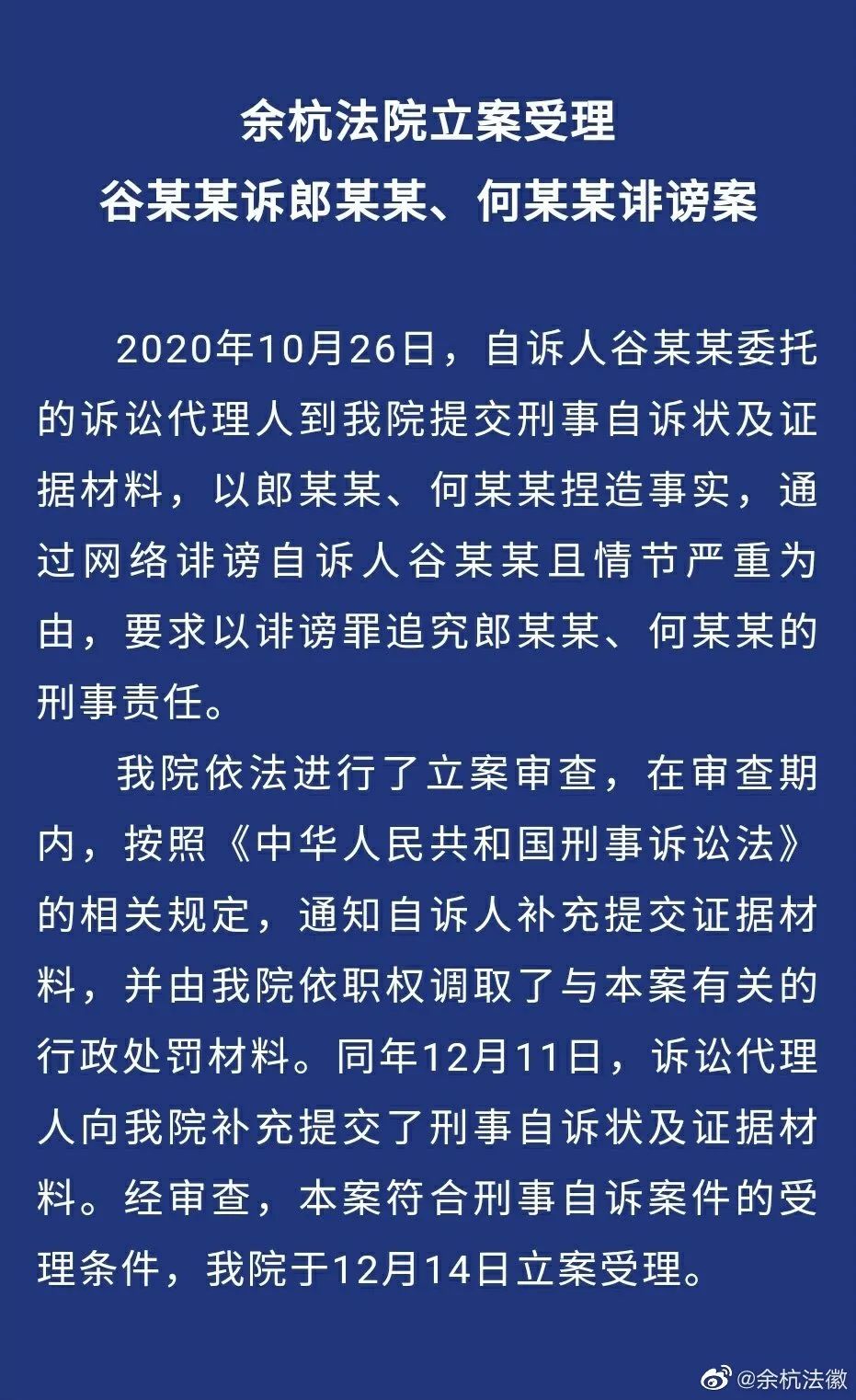 據杭州市餘杭區人民法院官方公眾號12月14日消息,10月26日,自訴人谷某某委託的訴訟代理人到我院提交刑事自訴狀及證據材料,以郎某某、何某某捏造事實,通過網絡誹謗自訴人谷某某且情節嚴重為由,要求以誹謗罪追究郎某某、何某某的刑事責任 。